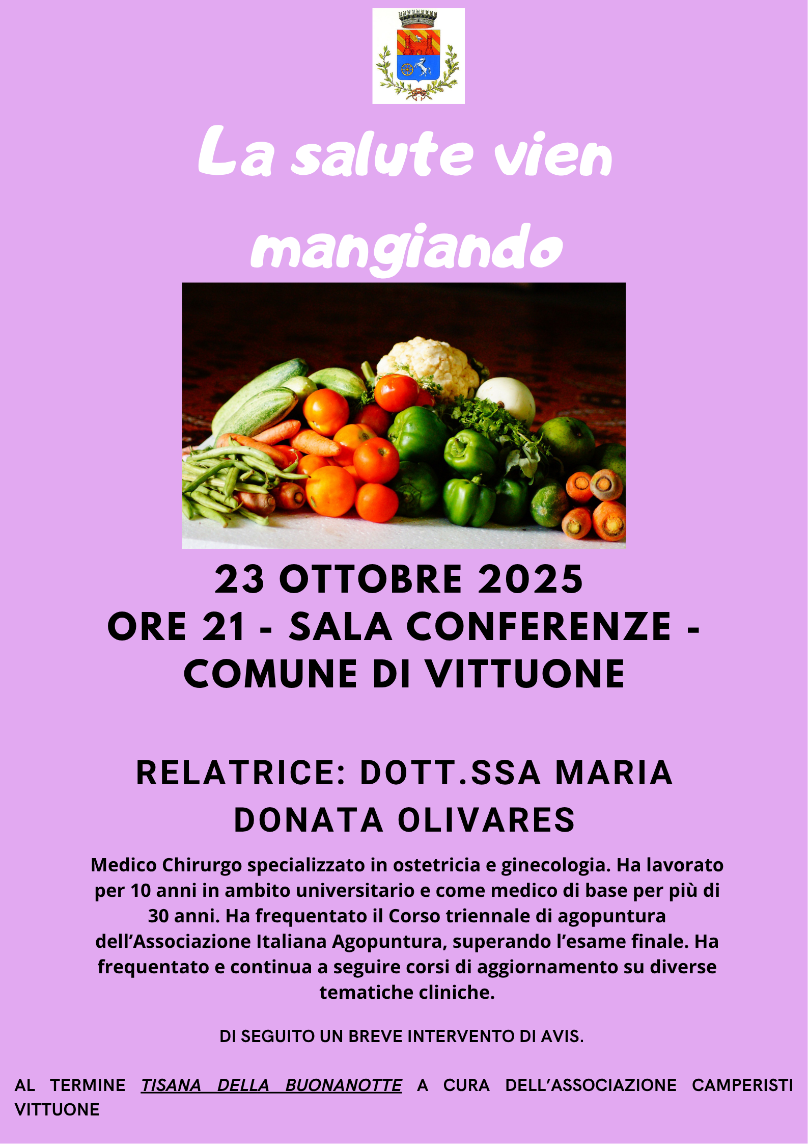 Il Comune è lieto di condividere l'invito alla Conferenza "La salute vien mangiando" che si terrà il 23 Ottobre 2025 alle ore 21 presso la Sala Conferenze del Comune di Vittuone.
