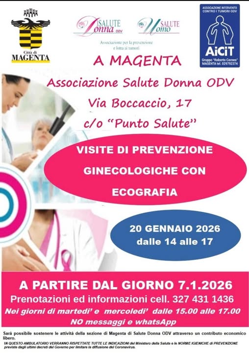 Si informa la cittadinanza che, a Magenta, l’Associazione Salute Donna ODV organizza visite ginecologiche di prevenzione con ecografia.