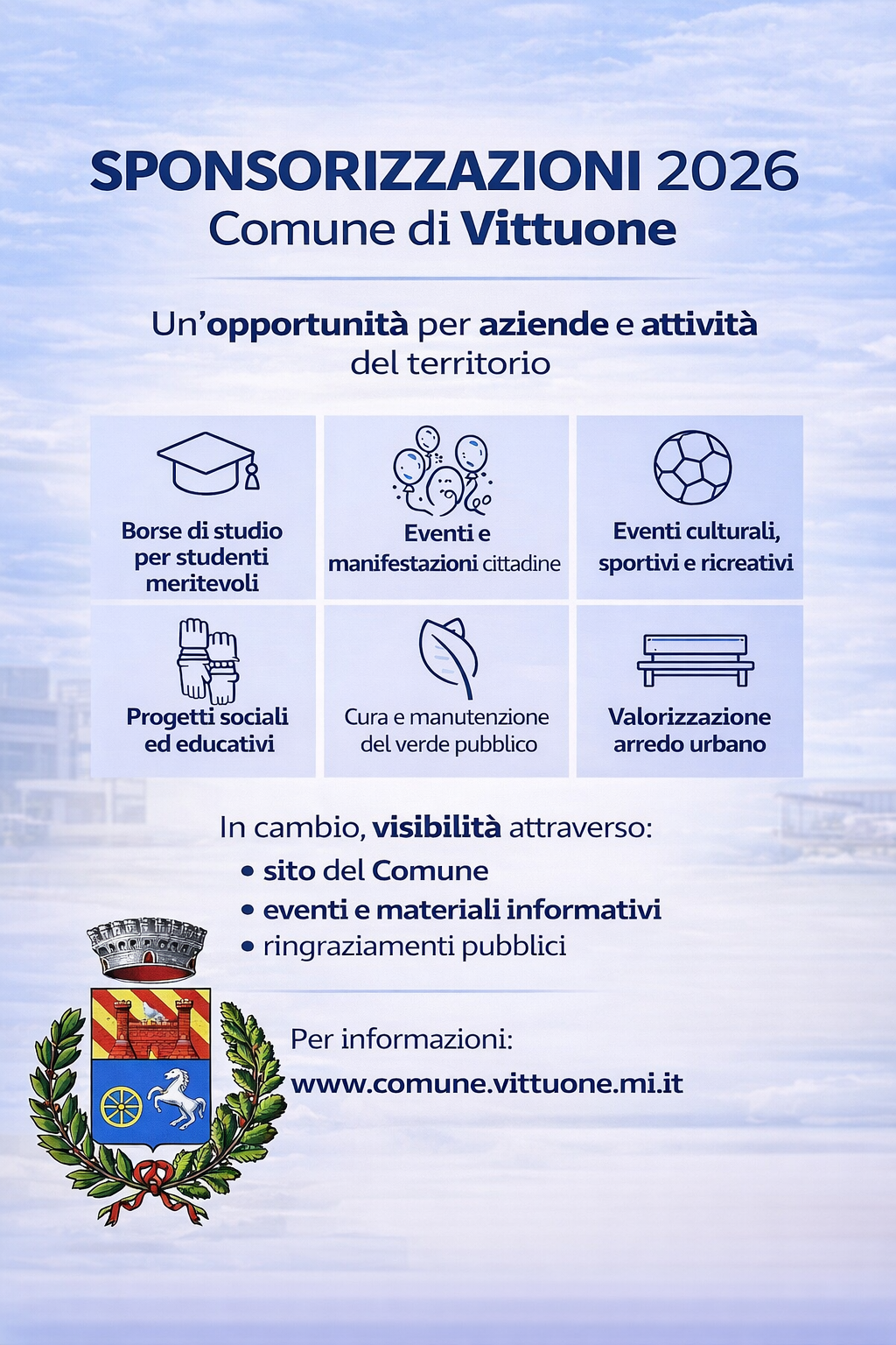 Il Comune di Vittuone invita imprese, attività economiche, associazioni e realtà del territorio a collaborare alla realizzazione delle iniziative previste nel Piano delle Sponsorizzazioni 2026, contribuendo allo sviluppo culturale, sociale e comunitario del paese.
